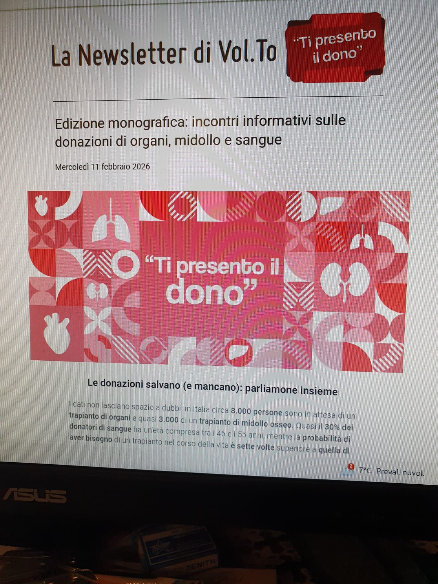 Grazie ad un accordo con Vol.To, è stata spedita questa newsletter per informare le altre associazioni della nostra disponibilità alla sensibilizzazione sul Dono della Vita.